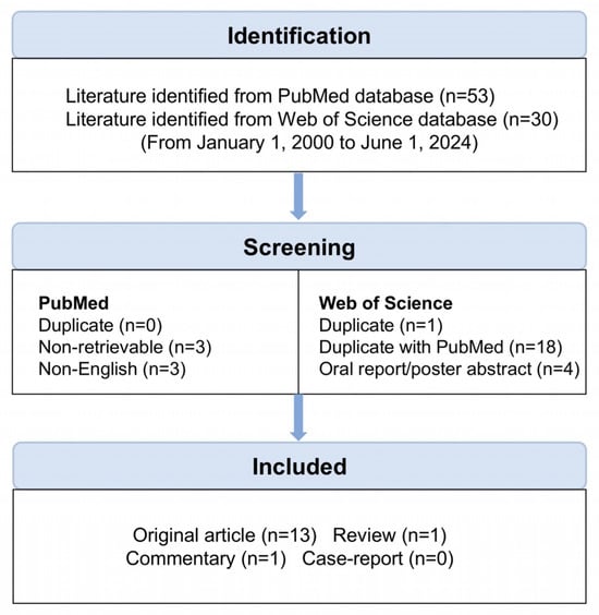 Search process. We performed a literature search using PubMed and Web of Science, covering publications from 1 January 2000 to 1 June 2024. Duplicate entries, non-retrievable ones, and non-English literature were excluded from the search results. The retrieved literature was categorized into four sections: original article, review, commentary, and case report. Each publication was meticulously reviewed to ascertain its relevance to the search terms and irrelevant articles were excluded from the final analysis. Finally, 13 original articles, 1 review, and 1 commentary were included.