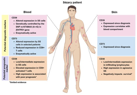 The expression of CD39 and CD73 varies in the epidermis of normal skin and skin lesions. In normal skin, CD39 is expressed at low levels in the dermis and on Langerhans cells in the epidermis, whereas CD73 is expressed in both the epidermis and the dermis [15,73]. The increased expression of CD39 and CD73 is observed in various tumors, including cutaneous malignancies. Studies by Whitley et al. demonstrated a higher frequency of CD39 in the area surrounding squamous cell carcinoma lesions compared to non-lesional tissue, indicating its potential role within the TME [74,75]. In skin biopsies of patients with SS, MF, and subcutaneous panniculitis-like T-cell lymphoma (SPTL), a significant increase in CD39 expression was observed compared to patients with benign inflammatory disorders. In addition, CD39 expression was found to be correlated between the blood and skin compartments [49]. This study confirms the previous data showing that both SS patients with a high expression of CD39 or CD73 in circulating CD4+ T cells also expressed elevated levels of CD39 or CD73 in the infiltrating lymphocytes of skin biopsies, with a predominant cytoplasmic and membranous distribution of CD39, and a diffuse membranous expression with a focal dot-like distribution of CD73. Notably, this aberrant expression was already appreciable by the time of diagnosis [47]. Furthermore, Scheffschick et al. performed a flow cytometry analysis in infiltrating NK and CD8+ T cells from 24 CTCL skin biopsies and observed a similar CD73 expression on both cell populations compared to healthy skin, with no significant differences [45].