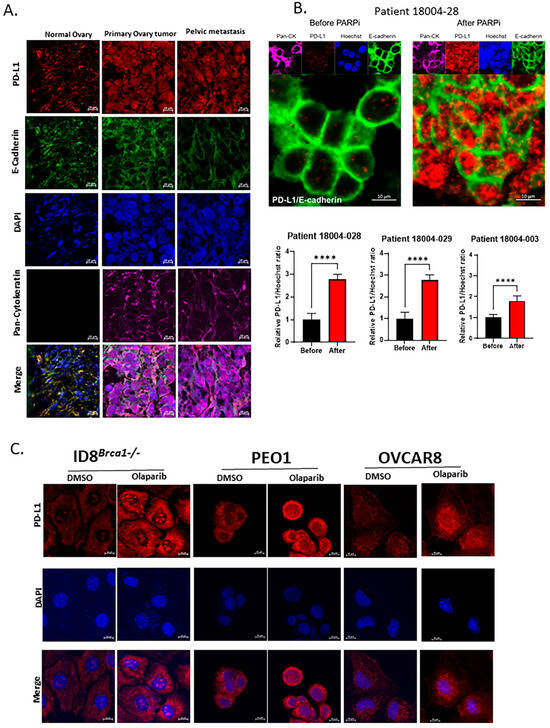 Intracellular PD-L1 accumulation in ovarian cancer-patient tumor samples and cell lines after PARPi treatment. (A) Immunofluorescence staining of normal ovary, primary tumor, and metastatic tissues from an ovarian cancer patient. PD-L1 staining is shown in red; pan-cytokeratin is shown in purple as a tumor marker, E-cadherin is shown in green as a cellular membrane marker, and nuclear DAPI staining is shown in blue. Scale bar, 10 μm. (B) Representative images of immunofluorescence staining of ovarian cancer-patient tumor samples before and after PARPi treatment. PD-L1 staining is shown in red; pan-cytokeratin is shown in purple as a tumor marker, E-cadherin is shown in green as a cellular membrane marker, and nuclear Hoechst staining is shown in blue. Scale bar, 10 μm. The bar graphs show the results of the statistical analysis for the quantification of PD-L1 levels in 3 pairs of ovarian cancer-patient tumor samples before and after PARPi treatment. Data are shown as the means ± SEMs, and Student’s t-test was used for statistical analysis. (**** p < 0.0001). (C) Immunofluorescence staining of PD-L1 in human and mouse ovarian cancer-cell lines PEO1, ID8Brca1−/−, and OVCAR8 following treatment with or without olaparib. Cells were cultured in growth media with 0.1% DMSO or 20 µM olaparib for 48 h. Red, PD-L1; blue, nucleus. Scale bar, 10 µm. All three cell lines presented significantly greater amounts of cytoplasmic and nuclear PD-L1 staining following olaparib treatment, compared to DMSO control treatment.