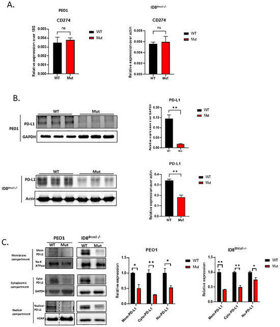 Acetylation site mutation decreases intracellular and surface levels of PD-L1 and induces PD-L1 protein degradation. (A) RNA levels of CD274 (PD-L1 gene) in PEO1 and ID8Brca1−/− cells overexpressing WT or Mut PD-L1. (ns= non-significant) (B) Western blot analysis of PD-L1 in PEO1 and ID8Brca1−/− cells overexpressing WT or Mutant PD-L1. The bar graphs show the results of the statistical analysis of triplicate lysate samples from 3 independent experiments. The data are shown as the means ± SEMs, and Student’s t-test was used for statistical analysis. (** p < 0.01). (C) Western blot analysis of membrane, cytoplasmic, and nuclear fractions derived from PEO1 and ID8Brca1−/− PD-L1 WT or Mut cells. Na-K ATPase, GAPDH, and H2AX were loading controls for each compartment. The bar graphs show the results of the statistical analysis of triplicate lysate samples from 3 independent experiments. The data are shown as means ± SEMs, and Student’s t-test was used for statistical analysis. (* p < 0.05, ** p < 0.01).