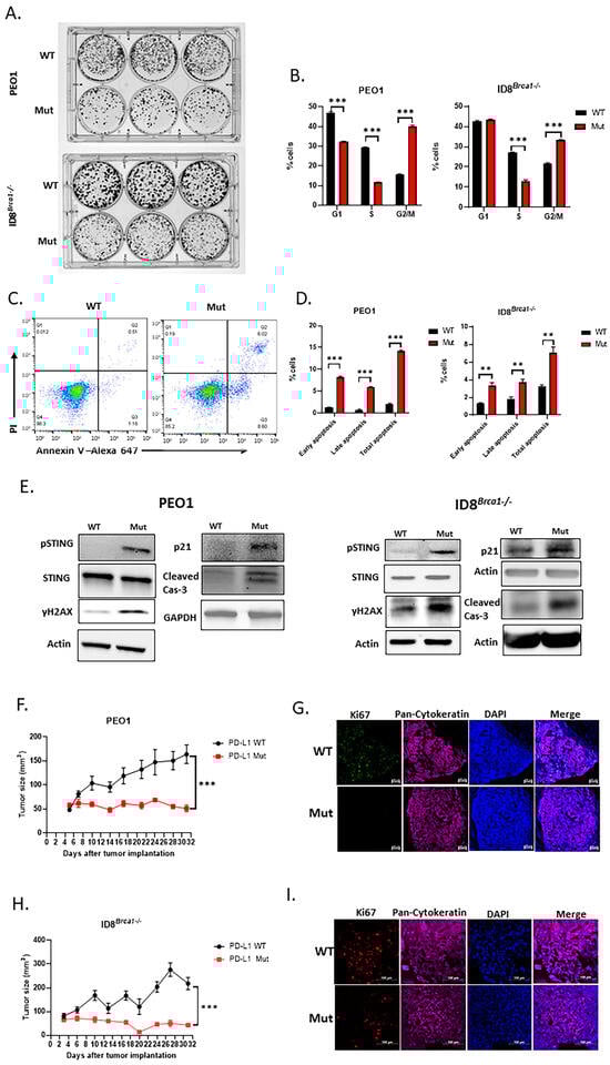 We next investigated the effect of the downregulation of PD-L1 expression through acetylation site mutation on tumor growth in vivo. We subcutaneously injected PEO1 (Figure 3F) or ID8Brca1−/− (Figure 3H) ovarian tumor cells into NSG mice. Our results revealed that the growth of the Mut tumors was significantly slower than that of the WT tumors. Tumor tissues were harvested at the endpoint, and proliferation rates were assessed via Ki67 staining. The results indicated that there was a significant reduction in Ki67+ cells in the tumor sections from the Mut group in both animal models (Figure 3G,I). These results further indicate that PD-L1 contributes to ovarian cancer-cell proliferation and tumor growth.