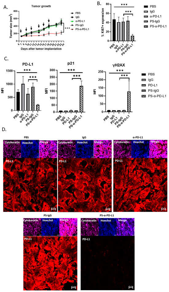 We further analyzed the tumors from all the treatment groups for tumor-cell proliferation via Ki67 immunostaining. Tumors from the mice treated with PS-α-PD-L1 presented significantly fewer proliferative cells, as indicated by the reduced number of Ki67+ cells in the tumor areas (Figure 5B). We also examined the PD-L1 expression level in tumor cells from mice treated with various antibodies. The results from immunostaining and confocal microscopic analysis revealed that PD-L1 levels in the tumors from mice treated with PS-α-PD-L1 were significantly lower than those from the mice receiving other treatments (Figure 5C,D). Furthermore, immunostaining and microscopic analyses revealed increased levels of p21 and the DNA damage marker γH2AX in tumors from mice receiving PS-α-PD-L1 treatment (Figure 5C). These in vivo results further suggest that decreasing intracellular PD-L1 protein levels via the PS-α-PD-L1 antibody induces tumor growth inhibition, which can be attributed to increases in tumor-cell DNA damage and p21.