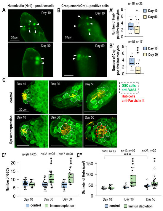Hemocytes are necessary to regulate the number of GSCs in the male germline during lifespan. (A,A′,B,B′) Hemolectin (Hml) and croquemort (Crq) hemocyte-specific Gal4s were used to express the UAS-GFPnls transgene. We found a decrease in the number of hemocytes in the apical part of the germline of aged male animals. (C) By immunohistochemistry, we labeled the germline with anti-VASA (green) and hub cells with anti-Faciclin III (red). The VASA-positive cells adjacent to the hub were considered GSCs according to the literature (dashed line). We induced immune cell apoptosis by hemocyte-specific overexpression of reaper (rpr) proapoptotic factor. (C′) The number of GSCs was significantly increased in immunodeficient 30- and 50-day samples. (C″) Due to the alteration in GSC number, we also measured the change in the size of hubs in testes from control and rpr-overexpressing animals at various ages. We also studied the size of the hub in testes at different ages by measuring the circumference of the hubs at their largest diameter (red dashed lines). Immunodeficiency significantly increased the hub diameter in older samples compared to age-matched controls. It is worth noting that hub size also increases in control samples during lifespan. The significance level was indicated as follows: * p < 0.05; ** p < 0.01; *** p < 0.001.