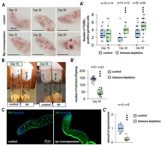 Due to the arising changes present under immune-depleted circumstances, we conducted fertility tests. In these tests, one male (UAS-rpr and control) was crossed with two females (Oregon-R) in vials. After two days, we discarded the individuals from the tubes. Then we examined the progeny (pupae and adults) present on the inside of the tube wall after five days (Figure 2B,B′ and Figure S3B).