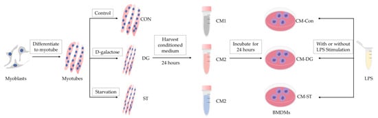 Flow chart including grouping, treatment, and procedure. CON, control myotubes; DG, myotubes treated by D-galactose for 24 h; ST, myotubes starved by incubating in EBSS (Earle’s balanced salt solution) for 7 h. CM1, conditioned medium derived from CON myotubes; CM2, conditioned medium derived from DG myotubes; CM3, conditioned medium derived from ST myotubes; BMDMs, bone marrow-derived macrophages; CM-Con, BMDMs incubated CM1 for 24 h; CM-DG, BMDMs incubated with CM2 for 24 h; CM-ST, BMDMs incubated with CM3 for 24 h; LPS, lipopolysaccharide.