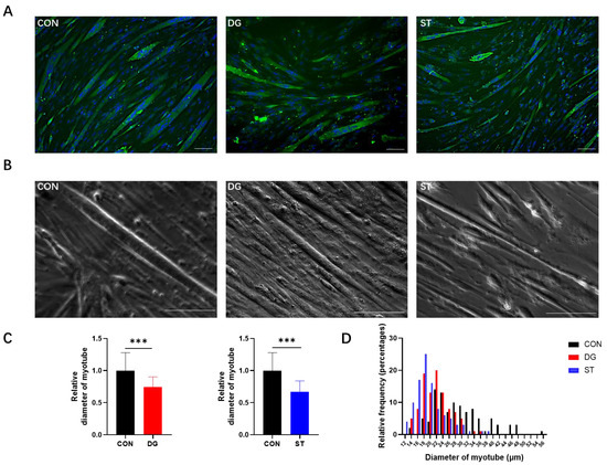 For immunofluorescence staining, C2C12 myotubes in the CON, DG, and ST groups were washed 3 times with PBS and fixed in 4% paraformaldehyde for 20 min. Then, myotubes were permeabilized in 0.1% Triton-X for 10 min and blocked in 5% BSA for 30 min. The primary and secondary antibodies were as follows: anti-myosin heavy chain (MHC) antibody (recognizes all MHC isoforms) at a concentration of 1:100 (MF20, Development Studies Hybridoma Bank at the University of Iowa, Iowa, USA), and F(ab’)2-Goat anti-Mouse IgG (H + L) Cross-Adsorbed Secondary Antibody Alexa Fluor® 488 conjugate (A11017, Thermo Fisher Scientific, Waltham, MA, USA). Nuclei were counterstained with DAPI (62247, Thermo Fisher Scientific, Waltham, MA, USA). Myotubes were photographed directly in wells under an all-in-one fluorescence microscope (BZ-X800, KEYENCE, Osaka, Japan) using a Plan Apo 10× objective lens and a Plan Fluor 40× Phase Contrast objective lens (Nikon, Tokyo, Japan). The myotube diameter was measured in MHC-stained myotubes, as previously described [24,25,26]. Briefly, in each group, the diameters were measured in a total of 100 myotubes from at least 20 fields that were captured from 4 independent samples. For each myotube, 5 measurements of diameter were obtained perpendicularly to the main axis of the myotube using the ImageJ software (version 1.54f, National Institutes of Health, Bethesda, MD, USA), and the average of these 5 measurements was considered as one single value. Relative myotube diameter was calculated by normalization to the myotube diameter of the CON group.