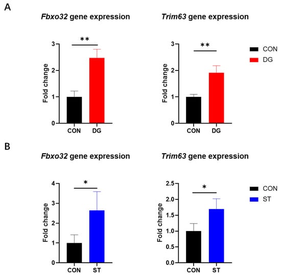 mRNA expression levels of muscle atrophy-related genes, including Fbxo32 and Trim63, in C2C12 myotubes after D-galactose treatment for 24 h (A) and starved by incubation in EBSS (Earle’s balanced salt solution) for 7 h (B). Data are presented as means ± SD. * p < 0.05, ** p < 0.01. n = 3 for the group in (A); n = 4 for the group in (B). CON, control myotubes; DG, myotubes treated by D-galactose for 24 h; ST, myotubes starved by incubating in EBSS for 7 h; Fbxo32, F-box protein 32; Trim63, tripartite motif-containing 63.