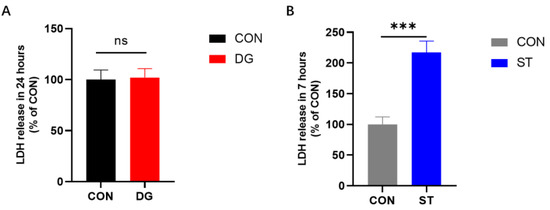 LDH (lactate dehydrogenase) release level after intervention with D-galactose and starvation in myotubes. (A) LDH release from untreated myotubes or D-galactose-treated myotubes in 24 h. (B) LDH release from untreated myotubes or starvation-treated myotubes in 7 h. Data are presented as means ± SD. ns: no significance observed. *** p < 0.001, n = 4. CON, control myotubes; DG, myotubes treated by D-galactose for 24 h; ST, myotubes starved by incubating in EBSS (Earle’s balanced salt solution) for 7 h; LDH, lactate dehydrogenase.