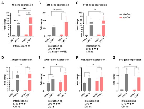 After LPS stimulation, compared to the CM-Con group, the expression levels of Il6 and Nfkb1 were significantly higher in the CM-DG group (Figure 5A,E). The Il1b gene expression level also showed an increasing trend in the CM-DG group (Figure 5B). However, there were no significant changes caused by CM intervention in Il12b, Tnf, Nos2, or Il10 gene expression (Figure 5C,D,F,G).