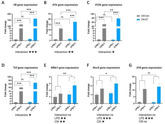 Inflammation-related gene expression in BMDMs (bone marrow-derived macrophages) incubated with control and starvation-treated myotube-derived CM (conditioned medium) with and without stimulation (A–G). Values are the means ± SD. ns: no significance observed. * p < 0.05, ** p < 0.01, *** p < 0.001, n = 4. LPS, lipopolysaccharide; CM, conditioned medium; Il6, interleukin 6; Il1b, interleukin 1 beta; Il12b, interleukin 12b; Tnf, tumor necrosis factor; Nfkb1, nuclear factor of kappa light polypeptide gene enhancer in B cells 1; Nos2, nitric oxide synthase 2; Il10, interleukin 10. CM-Con group, BMDMs incubated with CM from control myotubes for 24 h; CM-ST group, BMDMs incubated with CM from starvation-induced atrophic myotubes for 24 h.