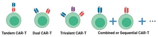 In addition to dual-target CAR-T cells, researchers have also designed trivalent CAR-T cells. In the treatment of B-cell malignancies, CD19, CD20, and CD22 are commonly used as combinational target antigens. Fousek et al. reported that CAR-T cells targeting these three antigens simultaneously can effectively eliminate tumor cells that have relapsed and become CD19-negative after CD19 CAR-T treatment; these, CAR-T cells can still form effective immune synapses with tumor cells [83]. Schneider and colleagues developed trispecific CD19-CD20-CD22-targeted CAR-T cells that rapidly and efficiently rejected leukemia and lymphoma tumors in vivo, whereas single-target CAR-T cells failed to inhibit tumor progression [84].