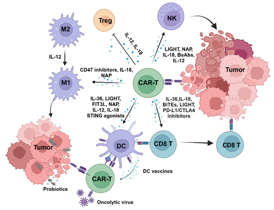 One effective strategy for modifying the TME has been to target the cytokine network. CAR-T cells armed with cytokines have demonstrated benefits in preserving stemness, reprogramming T cell metabolism, reducing exhaustion phenotypes, improving immune cell trafficking, and regulating the immune microenvironment [93,94]. CAR-T cells secreting IL-36 activate the Myd88-dependent pathway through autocrine mechanisms, enhancing their own proliferation and persistence while producing more IFN-γ and TNF-α, which support the activity of endogenous T cells and DCs [95]. IL-18 also has a positive role in remodeling the TME and exhibits good synergy when used in combination with CAR-T [96,97]. Recent studies have found that compared to conventional CAR-T cells, CAR-T cells secreting IL-18 can better eliminate low-antigen density myeloma cells by reprogramming the immune microenvironment [98]. By expressing tumor necrosis factor superfamily member 14 (LIGHT), CAR-T cells targeting prostate-specific membrane antigen (PSMA) can induce a variety of LTβR-related chemokines and adhesion molecules, remodeling the vasculature and lymphatic structures within the tumor, thereby enhancing the infiltration of DCs, NK cells, and T cells [99]. IL-12 possesses broad pro-inflammatory and antitumor effects. It promotes T cell differentiation toward a Th1-type immune response, inhibits Treg function, enhances antigen presentation, and reprograms tumor-associated macrophages (TAMs) to an M1 phenotype [100,101]. Based on these properties, IL-12 is often used in combination with CAR-T cells, playing a powerful role in the treatment of both solid tumors and hematologic malignancies [102,103].