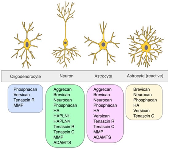 Cell-type-specific production of perineuronal net components. The figure illustrates the sources of various PNN components: oligodendrocytes [42,43,44,45], neurons [27,42,43,44,45,46,47,48,49,50], astrocytes [27,42,43,44,45,46,47,48,49,50], and reactive astrocytes [44,45,46,47,51]. Each cell type is represented with its characteristic morphology, accompanied by a list of the corresponding PNN components produced. Summarized in [39,52,53]. (Illustration by Jörg Pekarsky, Institute of Functional and Clinical Anatomy, FAU Erlangen-Nürnberg).