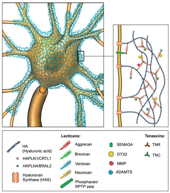 Schematic representation of the structure and composition of perineuronal nets (PNNs). The backbone of perineuronal nets is formed by hyaluronic acid (HA), which facilitates the binding of chondroitin sulfate proteoglycan (CSPG) lecticans via the link proteins HAPLN1 (CRTL1) and HAPLN4 (BRAL2). HA is produced by hyaluronan synthases (HASs) embedded in the neuronal membrane. The CSPG triads are further stabilized by tenascin-R (TNR), whereas tenascin-C (TNC) interacts with individual CSPGs. In addition to the HA attachment, CSPGs are linked to the cell membrane via interaction with the phosphacan/RPTPzeta receptor. The physiological remodeling of PNNs is mediated by two families of proteolytic enzymes: matrix metalloproteinases (MMPs) and a disintegrin and metalloproteinase with thrombospondin motifs (ADAMTSs). Additional molecules, such as OTX2 and SEMA3A, play a role in PNN maturation by binding to the glycosaminoglycan (GAG) side chains of CSPGs. Abbreviations: CSPG = chondroitin sulfate proteoglycans; HA = hyaluronic acid; TNR = tenascin-R; HAPLN = hyaluronan and proteoglycan link protein; ADAMTS = a disintegrin and metalloproteinase with thrombospondin motifs; OTX2 = orthodenticle homeobox 2; SEMA3A = semaphorin 3A; GAG = glycosaminoglycan; MMP = matrix metalloproteinase. (Illustration by Jörg Pekarsky, Institute of Functional and Clinical Anatomy, FAU Erlangen-Nürnberg).