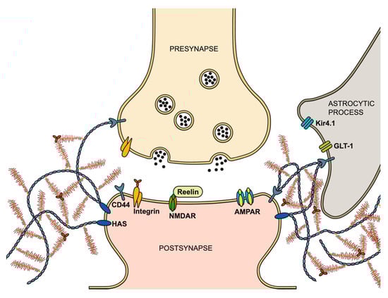 Schematic illustration of the tetrapartite synapse concept. In addition to the presynaptic terminal, postsynaptic terminal, and adjacent astrocytic process, the ECM plays a critical role in modulating synaptic transmission. The presynaptic terminal (yellow) contains CD44 and integrin receptors within its membrane and releases neurotransmitters via synaptic vesicles into the synaptic cleft. At the postsynaptic site (orange), neurotransmitter receptors, such as glutamate receptors NMDAR and AMPAR, are present. The enzyme HAS produces the HA backbone to which lecticans are attached, and these lecticans are linked in triads via TNR. Integrin receptors in the postsynaptic membrane are hypothesized to interact with TNR, while reelin modulates synaptic plasticity through its interaction with NMDAR. The astrocytic process (gray) contains the potassium channel Kir4.1 and the glutamate transporter GLT-1 and features the CD44 receptor, which anchors the HA backbone [81,82,83,84,85]. (Illustration by Jörg Pekarsky, Institute of Functional and Clinical Anatomy, FAU Erlangen-Nürnberg).