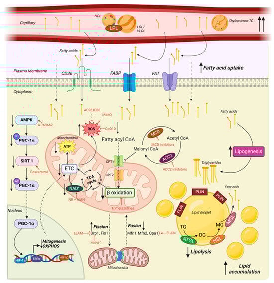 A summary of lipotoxicity and mitochondrial dysfunction in heart failure and the related treatments. Maintaining a balance between lipid uptake, usage, storage, and hydrolysis, as well as mitochondrial homeostasis and dynamics, is crucial for efficient functioning of the heart. A disturbance in this balance gives rise to harmful consequences, including lipotoxicity, leading to heart failure. Potential treatments are indicated in red. ACC2, Acetyl coenzyme A carboxylase 2; AMPK, AMP-activated protein kinase; ATGL, Adipose triglyceride lipase; ATP, Adenose triphosphate; CD36, Cluster of differentiation 36; CoQ10, Coenzyme Q10; CPT1, Carnitine palmitoyl transferase 1; CPT2, Carnitine palmitoyl transferase 1; DG, Diglyceride; DRP1, Dynamin-related protein 1; ELAM, Elamipretide; ERR, Estrogen-related receptor; ETC, Electron transport chain; FABP, Fatty acid binding protein; FAT, Fatty acid transport protein; FIS1, Mitochondrial fission protein 1; HDL, High-density lipoprotein; HIF, Hypoxia-Inducible Factor; HSL, Hormone-sensitive lipase; LDL, Low-density lipoprotein; LPL, Lipoprotein lipase; MCD, Malonyl CoA decarboxylase; MFN1, Mitofusin 1; MFN2, Mitofusin 1; MG, Monoglyceride; MGL, Monoglyceride lipase; NAD, Nicotinamide adenine dinucleotide; NMN, Nicotinamide mononucleotide; NR, Nicotinamide riboside; NRF, Nuclear Respiratory Factors; OPA1, Optic atrophy 1; OXPHOS, Oxidative phosphorylation; PGC-1α, Peroxisome Proliferator-Activated Receptor-γ Coactivator 1α; PLIN, Perilipin; ROS, Reactive oxygen species; SIRT1, Sirtuin 1; TCA, Transport electron chain; TG, Triglyceride; VLDL, Very low-density lipoprotein.