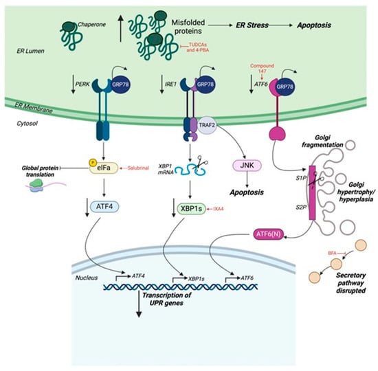 The endoplasmic reticulum (ER) is an interconnected network of membrane-like structures. It is an organelle of utmost importance due to its role in protein translation, post-translational modification, vesicular trafficking of proteins, Ca2+ homeostasis, and lipid biosynthesis [171]. Various physiological and pathological insults, including hypoxia, oxidative stress, Ca2+ depletion, energy deprivation, DNA damage, and altered glycosylation, can trigger improper protein folding, leading to ER stress [172]. In response to ER stress, cells elevate their protein folding capacity and machinery, terminate protein synthesis, and activate the ER-associated protein degradation (ERAD) pathway. These responses are products of the unfolded protein response (UPR), consisting of three major signaling branches governed by the transmembrane proteins, inositol-requiring protein 1 (IRE1), double-stranded RNA-dependent protein-kinase-like ER kinase (PERK), and activating transcription factor 6 (ATF6). Prolonged and unresolvable ER stress triggers apoptosis to dispose of unhealthy cells beyond repair [173,174].
