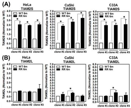 Figure 1. Augmented TIAM2S but not TIAM2L shown in radioresistant (RR: 6 months) clones compared to their parental wild-type (WT) clones generated from HeLa, CaSki and C33A cervical cancer cells. Expression levels of (A) TIAM2S and (B) TIAM2L in WT and RR cervical cancer cells: HeLa, CaSki, and C33A cells. Cells were cultivated and collected, the total RNA was extracted, and expression levels of TIAM2S and TIAM2L transcripts were measured by quantitative RT-PCR analysis, as described in Section 2.3. The results were from three independent clones of HeLa, CaSki, and C33A cells; each clone was repeated at least three times, and the results were similar. Data are shown as means ± SD. Asterisk symbol (*) denoted significant differences between groups when Mann–Whitney U Test analysis yielded p < 0.05.