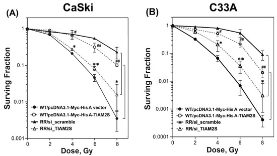 Figure 2. Radiation survival curve of cervical cancer cells was executed on cells in log-phase growth to estimate radiosensitivity. Wild-type (WT) cells were transfected with pcDNA3.1-Myc-His A vector alone (3 μg) or pcDNA3.1-Myc-His A-TIAM2S (3 μg), whereas radioresistant cells were transfected with siRNA of scrambled NC (30 nM, also termed si_scramble) or siRNA of TIAM2S (30 nM; also termed si_TIAM2S), respectively, as described in Section 2.4. CaSki and C33A cells were plated, irradiated, and analyzed to estimate the clonogenic surviving fraction at the designated dosages of radiation. All of the clonogenic assays were repeated at least three times, as described in Section 2.5. The survival curve showed decreased radiosensitivity in the radioresistant clones of (A) CaSki and (B) C33A cells compared to their parental wild-type cells. RR cells transfected with siRNA of TIAM2S abridged the surviving fraction (elevated radiosensitivity), while WT cells transfected with pcDNA3.1-Myc-His A-TIAM2S increased it (decreased radiosensitivity). Data are shown as means ± SD. Solid filled circles curve: WT-pcDNA3.1-Myc-His A vector alone; dotted open circles curve: WT- pcDNA3.1-Myc-His A-TIAM2S; solid filled triangle curve: RR-siRNA of scrambled negative control; dotted open triangle curve: RR-siRNA of TIAM2S. Each experiment was performed in triplicate, and the results were similar. * p < 0.05, ** p < 0.01, for the si_TIAM2S group vs. the si_scramble group. # p < 0.05, ## p < 0.01, for the pcDNA3.1-Myc-His A-TIAM2S group vs. pcDNA3.1-Myc-His A vector group.