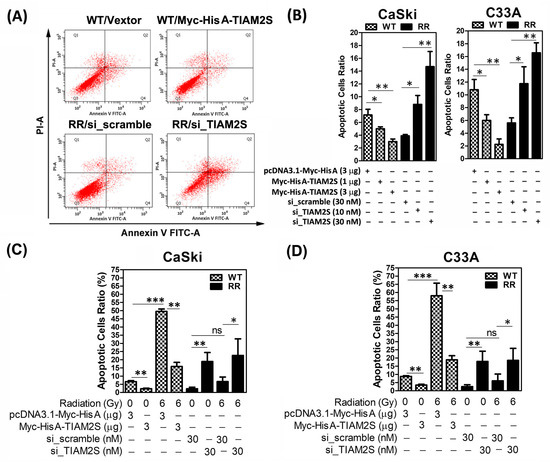 Figure 3. Decreased apoptotic cell ratio was shown in radioresistant CaSki and C33A cells, and knockdown of TIAM2S reinforced apoptosis in radioresistant cervical cancer cells. (A) Representative figure of flow cytometric analysis of Annexin-V/PI double staining shown on CaSki-WT and-RR cells. Designed cells were pre-transfected with pcDNA3.1-Myc-His A-TIAM2S (3 μg) or vector alone (3 μg), siRNA of scrambled NC (30 nM) or siRNA of TIAM2S (30 nM), respectively. After 72 h of transfection, cells were collected and the apoptosis rate was assessed, as described in Section 2.6. A summary of the apoptotic cell ratio (sum of annexin V-positive/PI-negative and annexin V-positive/PI-negative cells) is shown in (B). We investigated the in vitro relevance of TIAM2S involved in cell apoptosis regulation under with or without 6 Gy radiation treatment. (C) CaSki-WT or (D) C33A-WT cells were pre-transfected with pcDNA3.1-Myc-His A-TIAM2S construct or vector alone, respectively, whereas CaSki-RR cells were pre-transfected with siRNA of scrambled NC (30 nM) or siRNA of TIAM2S (30 nM), respectively. After 72 h of transfection, designed cells were resubjected to 0 Gy (without radiation treatment) or 6 Gy radiation treatment. Apoptotic cell ratio was assessed at 48 h after 0 Gy or 6 Gy radiation treatment, and a summary is provided. Data were obtained from three independent experiments in triplicate and are shown as the mean ± SD. * p < 0.05, ** p < 0.01, *** p < 0.001; “ns” indicates no significance (p > 0.05).
