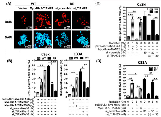 Figure 4. Augmented cell proliferation was shown in radioresistant CaSki and C33A cells in vitro and TIAM2S blockage significantly revoked RR-increased cervical cancer cell migration. (A) Representative pictures show new DNA replication in wild-type (WT) and radioresistant (RR) CaSki cells. In brief, serum-starved cells were cultured for 24 h, and then 5′-bromo-2′-deoxyuridine (BrdU; 100 µg/mL) was added to culture media 6 h before cells were fixed for BrdU staining. BrdU-positive cells (newly proliferating cells, red fluorescence) were stained using a cell proliferation assay kit, as described in Section 2.7, to estimate cell proliferation. DAPI (4′,6-diamidino-2-phenylindole) staining was shown by blue fluorescence for nuclear counterstaining. Nine to twelve randomly selected fields were inspected for counting BrdU-positive cells, with a summary shown in (B). For each experiment, at least 500 cells were counted to quantify BrdU-positive cells. (C) A summary of BrdU-positive cells designated WT and RR cervical cancer cells, which were transfected with various dosages of pcDNA3.1-Myc-His A-TIAM2S or vector alone, and siRNA of scrambled NC or siRNA of TIAM2S for 72 h, respectively. (D) We elucidated the in vitro impact of TIAM2S in regulating cell proliferation with or without 6 Gy radiation treatment. CaSki-WT or C33A-WT cells were pre-transfected with pcDNA3.1-Myc-His A-TIAM2S construct (3 μg) or vector alone (3 μg), respectively, whereas RR cells were pre-transfected with siRNA of scrambled NC (30 nM) or siRNA of TIAM2S (30 nM), respectively. After 72 h of transfection, designed cells were resubjected to 0 Gy or 6 Gy radiation treatment; BrdU-positive cells was assessed and a summary was provided. Data are shown as mean ± SD of three independent experiments using different batches of cells. * p < 0.05, ** p < 0.01, *** p < 0.001; “ns” indicates no significance (p > 0.05).