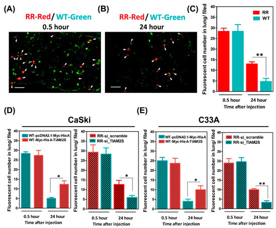 Figure 6. Increased lung localization and survival rates were shown in BALB/c nude mice after tail-vein injection of radioresistant CaSki cells; ectopic introduction of TIAM2S notably abridged radioresistance-augmented lung localization. CaSki-WT (green fluorescence) and CaSki-RR cells (red fluorescence) were mixed in a 1:1 ratio and injected into BALB/c nude mice via tail-vein injection, as described in Section 2.9 and Section 2.10. Representative fluorescence micrographs of frozen sections of mouse lung at (A) 0.5 and (B) 24 h after tail-vein injection are shown. White arrows indicate red fluorescent CaSki-RR cells. Scale bar = 200 μm. Similar results were collected for the six mice in each group. (C) Summary of number of fluorescent cells in lung (red fluorescence indicating CaSki-RR cells vs. green indicating CaSki-WT cells). Summary of number of fluorescent (D) CaSki or (E) C33A cells retained in lung. Data are mean ± SD from six independent experiments. * p < 0.05, ** p < 0.01.