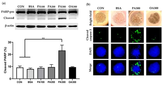 Next, we performed Western blot and immunostaining to determine cell apoptosis in palmitate-treated spheroids. Palmitate-induced cell apoptosis was first evaluated by Western blot analysis of cleaved poly (ADP-ribose) polymerase (PARP). During caspase-dependent apoptosis, PARP, a nuclear protein, is cleaved by caspases 3 and 7 at its caspase-cleavage site, generating an 89 kDa fragment [,,]. As shown in Figure 3a, palmitate exposure caused a dose-dependent increase in cleaved PARP. Palmitate (300 µM) stimulated the cleavage of PARP to an 89 kDa fragment, whereas PARP fragmentation was not affected by a high concentration of unsaturated oleate. Palmitate-induced cell apoptosis was confirmed by immunostaining for active caspase-3 (Figure 3b). In both normal and BSA controls, very few cleaved caspase-3-positive cells were detected in the middle of spheroids. Palmitate (300 µM) treatment led to a substantial activation of caspase-3 with more staining in dissociated peripheral cells of spheroids, whereas caspase-3 activity was not altered upon oleate stimulation.
