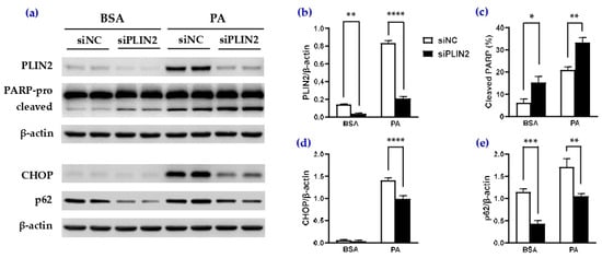 As a constitutively expressed LD protein, PLIN2 is also required for the formation and stability of the LD organelle [,]. Previous studies have indicated a role of PLIN2 in modulating autophagy, ER stress resolution, and β cell survival and function [,]. To examine the significance of PLIN2 upregulation in palmitate-mediated lipotoxicity, we performed siRNA transfection to knock down PLIN2 (siPLIN2) in Caki-1 cells. Compared to negative siRNA (siNC) transfection, Western blot analysis confirmed that siPLIN2 transfection led to a ~80% decrease in PLIN2 in BSA-treated cells and greatly inhibited palmitate-induced PLIN2 upregulation (Figure 7a,b). The downregulation of PLIN2 resulted in an increase in cleaved PARP in BSA-treated cells (Figure 7a,c). Moreover, siPLIN2 significantly enhanced palmitate-stimulated PARP fragmentation, indicating an exacerbation of apoptotic cell death by PLIN2 deficiency. Palmitate-mediated CHOP and p62 upregulation was suppressed by siPLIN2 (Figure 7a,d,e). These results suggest that PLIN2 expression exhibits a cytoprotective role under basal conditions and upon palmitate overload.