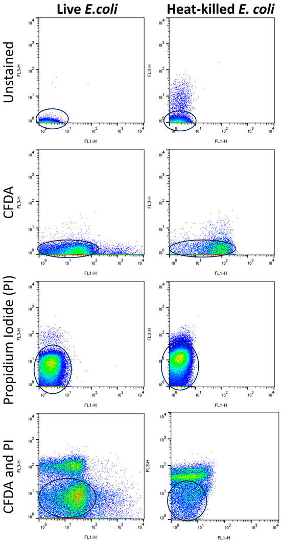 Using a FACSCalibur® (Becton Dickinson Immunocytometry Systems [BDIS], San Jose, CA, USA) with a 488 nm laser and CellQuestPro Version 5.2.1 software for data acquisition, data were acquired. Calibrite beads (BDIS) were used with FACSComp software v. 6.0 (BDIS) for instrument calibration. Events for each replicate were collected in duplicate at >1000 s−1, with ~300 K total event counts for each metabolic assay. Density plots using green (FL1-H) (CFDA) and red fluorescence (FL3-H) (PI), with FSC-H as threshold were used to present metabolic data. Unstained and auto-fluorescent cells were gated out of analyses (Figure 1). For analysis, density plots were used with FlowJo™ software, Version 10.7.0 (FlowJo Flow Cytometry Analysis Software, Ashland, OR, USA). To validate staining and optimize instrument settings, staining controls included live and heat-killed E. coli that were unstained, dual-stained, or individually stained with PI or 5(6)-CFDA (Figure 1).