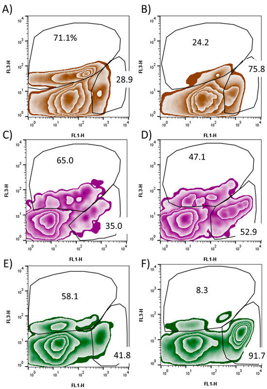Representative flow cytometric zebra plots display representative analyses of metabolic activity in strains of bacteria that were laboratory-exposed to organic wastewater compounds. Percentages of stained cells are presented, whereby the upper gate is that of the metabolically inactive cells and the right-hand gate shows the metabolically active percentage. In panels (A,B): Escherichia coli was incubated with atrazine and tylosin, respectively. (C,D): Streptococcus suis was incubated with trenbolone and butylparaben, respectively. (E,F): Streptococcus dysgalactiae was incubated with atrazine and tylosin, respectively. Staining with 5(6)-carboxyfluorescein diacetate yields a fluorescent product upon hydrolysis by esterases (horizontal axis; FL1-H; green fluorescence), and propidium iodide counter-stains nucleic acids in membrane-damaged cells (vertical axis; FL3-H; red fluorescence). Unstained or auto-fluorescent particles were out-gated for the analyses (e.g., ungated population near the origin) (Figure 1).