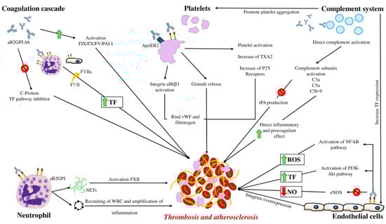 Although the major role of the APS-related thrombotic process is performed through the interaction of antibodies with endothelial cells, the coagulation cascade, platelets, neutrophils, and the complement system also play roles (as shown in Figure 1).