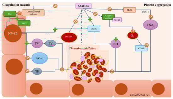 Moreover, statins can counteract platelet activation and aggregation, as evidenced by ex vivo studies on functional platelet aggregation and assessments of circulating soluble CD40L and P-selectin []. This inhibitory effect is primarily achieved through the downregulation of COX-1 and the upregulation of eNOS [,,]. Additional mechanisms include the downregulation of NOX2 (the catalytic subunit of NADPH oxidase) and phospholipase A2, resulting in lower levels of PGE2 and TXA2 []. Furthermore, alterations in the lipid composition of platelet membranes reduce their flexibility and activation [].