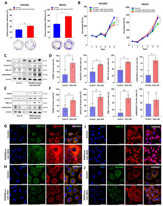 Effects of ASC-derived sEVs or CM secretome on OC colony formation efficiency (A), proliferation rate (B), and protein expression of TGFβ signaling pathway members assessed by Western blot (C–F) and confocal microscopy (G–J). (A) Colony formation efficiency was calculated as the ratio of the number of colonies formed to the number of cells seeded. Representative images show OC colonies after 8 days of culture and after staining with 0.2% crystal violet. (B) Proliferation rate of the OC groups normalized by the densitometric quantification of each group on day 1 of culture. (C,E) Western blotting bands showing the protein levels quantified for TGFβII, Smad 2/3, ERK 1/2, and erbB2/HER-2 in OVCAR3 (D) and SKOV3 (F) cells after treatment of triplicates with 50% ASC-derived CM secretome for 6 days and normalization by β-actin. Representative images of confocal microscopy analysis showing the expression of ERK1/2, p38alpha, Survivin, and BMP2/4 marked in OVCAR3 (G,H) and SKOV3 (I,J) cells after 6 days of culture under control conditions (monoculture) and indirectly co-cultured with ASCs. Statistical significance is indicated as * p < 0.05 and ** p < 0.01. Scale bars = 50 µm.