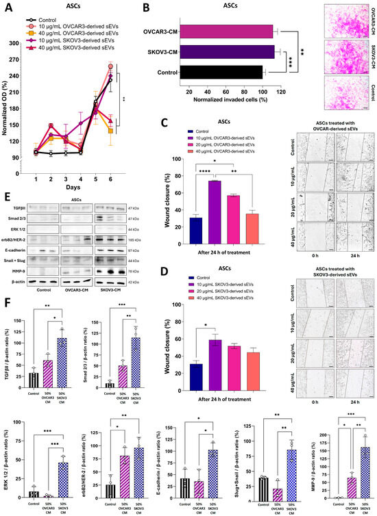 To elucidate the impact of bidirectional communication between OC cells and ASCs, which were successfully characterized as MSCs (Appendix A), we investigated how extracellular signaling molecules released from the tumor cells may influence some characteristics of ASCs. As demonstrated in Figure 4A, treatment with sEVs from both OC cell lines caused a dose-dependent effect in the proliferation rate of ASCs after 6 days of culture. While ASCs treated with 10 µg/mL of sEVs from both OVCAR3 and SKOV3 cells showed proliferation levels similar to the control, a higher dosage of 40 µg/mL from OC cells significantly reduced (p < 0.05) ASC proliferation (Figure 4A). The treatments with OC-derived sEVs also differed (p < 0.05) between the two dosages (Figure 4A). Subsequently, ASCs were treated with 50% OC-derived CM to assess the impact on their invasive potential. Treatment with CM secretome derived from either OVCAR3 or SKOV3 cells resulted in an increase in the invasiveness of ASCs (p < 0.01) (Figure 4B). These findings were further supported when we evaluated the effects of OC-derived sEVs on ASC migration using the wound healing assay (Figure 4C,D). Notably, the migratory capacity of ASCs significantly increased following treatment with 10 µg/mL of sEVs from OVCAR3 (74.1%) or SKOV3-derived sEVs (58.9%) compared to control after 24 h of culture. However, higher doses of sEVs resulted in a reduced increase in the migration of ASCs, with no significant changes observed, except for treatment with 20 µg/mL of OVCAR3-derived sEVs, which achieved 57.1% of wound closure (p < 0.05).