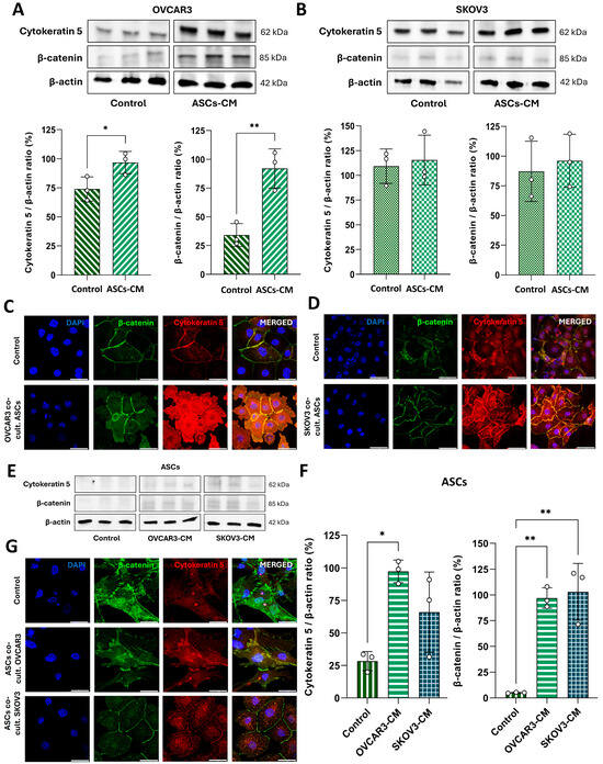 In ASCs, treatment with OVCAR3-derived CM showed elevated Cytokeratin 5 expression (p < 0.05), while secretome from both OC cells lines significantly upregulated (p < 0.01) β-catenin expression (Figure 6E,F). Despite this, immunolocalization analysis revealed a downregulation in β-catenin expression, particularly in cells indirectly co-cultured with SKOV3 (Figure 6G). In contrast, Cytokeratin 5 expression was markedly increased in response to both OC cell lines (Figure 6G).