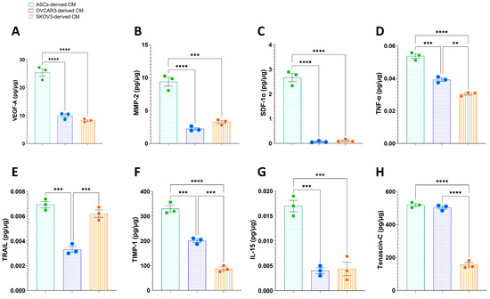 Multiplex analysis of extracellular signaling mediators derived from ASC- and OC-derived CM secretome. The concentrations of VEGF-A (A), MMP-2 (B), SDF-1α (C), TNF-α (D), TRAIL (E), TIMP-1 (F), IL-15 (G), and Tenascin-C (H) were measured in the CM secretomes of ASCs, OVCAR3, and SKOV3 cell lines under control conditions. Values were obtained in pg/mL and normalized to the total protein concentration of each sample, which results presented as pg/μg of protein. Statistical significance is indicated as ** p < 0.01, *** p < 0.001, and **** p < 0.0001.