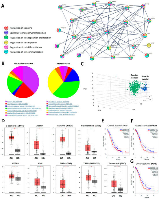 Functional enrichment analysis of targets modulated by the treatments with CM secretome and sEVs from ASCs and OC cells and overall survival of OC patients. (A) Protein–protein interaction (PPI) network illustrating the primary biological processes associated with the identified molecular targets (PPI enrichment p-value < 1.0 × 10−16). (B) Pie chart representing the most prominent molecular functions linked to these proteins and their class. (C) Principal component analysis (PCA) distinguishing OC patients and individuals with healthy ovarian tissue based on gene expression profiles of selected molecular targets (TCGA and GTEx datasets). (D) Gene expression profiles of E-cadherin (CDH1), MMP9, Survivin (BIRC5), Cytokeratin 5 (KRT5), VEGF-A (VEGF-A), IL-15 (IL15), TNF-α (TNF), TRAIL (TNFSF10), and Tenascin-C (TNC), comparing ovarian cancer (OC) patients to healthy ovary (HO) samples (|Log2FC|Cutoff: 1; p < 0.01; jitter size of 0.4; number of samples: 426 OC and 88 HO). (E–G) Kaplan–Meier survival curve illustrating the overall survival of OC patients, based on TCGA data, and stratified by gene expression levels (Cox regression analysis). * p < 0.05.