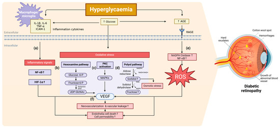 Figure 1. Mechanisms of hyperglycemia-induced pathogenesis in DR. Elevated glucose levels induce inflammatory responses, oxidative stress, and metabolic dysregulation, which lead to endothelial dysfunction, vascular leakage, and neovascularization in the retina. Hyperglycemia activates macrophages and microglia, promoting the release of pro-inflammatory cytokines (IL-1β, IL-6, TNF-α, ICAM-1), which further stimulate NF-κB and HIF-1α signaling (a). Oxidative stress enhances the activation of metabolic pathways, including the hexosamine pathway (b), protein kinase C (PKC) activation (c), and the polyol pathway (d), contributing to VEGF upregulation and vascular dysfunction. Additionally, hyperglycemia leads to the formation of advanced glycation end-products (AGEs), which activate RAGE signaling (e), resulting in increased NADPH oxidase activity and reactive oxygen species (ROS) production. The accumulation of ROS exacerbates oxidative stress, endothelial cell death, and vascular permeability. The cumulative effect of these processes results in pathological neovascularization and vascular leakage (f), leading to retinal damage characteristic of DR. The right panel depicts retinal abnormalities and typical fundus features associated with DR, including increased neovascularization, cotton wool spots, and hard exudates. Created in BioRender. Seo, H. (2025) https://BioRender.com/n23b627 (accessed on 30 January 2025).