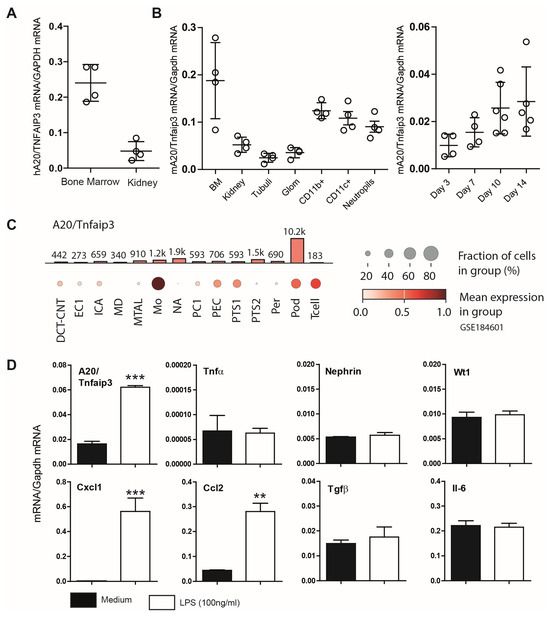 (A) Basal mRNA expression of A20/Tnfaip3 in human tissues. Quantitative real-time PCR analysis of prenormalized cDNA derived from poly-(A)-selected DNase-treated RNA isolated from human bone marrow and kidney. Transcript expression levels were calculated via the use of human glyceraldehyde-3-phosphate dehydrogenase (GAPDH) as a housekeeping gene. The data are shown as the means ± SDs. (B) Quantitative real-time PCR analysis of cDNA derived from RNA isolated from murine (C57BL/6) tissues and kidney cells/compartments as well as K5P5 cells after day 3, 7, 10, and 14 of differentiation was performed as described in the Section 2. The detected mRNA expression levels were calculated via the use of murine Gapdh as a housekeeping gene. Data are shown as the means ± SDs. (C) The data show the expression pattern of Tnfaip3 in the kidney (GSE184601). The analysis indicates high Tnfaip3 expression in monocytes (Mos), glomeruli parietal epithelial cells (PECs), proximal tubule segment 1 (PTS1), podocytes (Pods), and T lymphocytes (Tcell). The analysis indicates low Tnfaip3 expression in intercalated cell type A (ICA), distal convoluted tubule–connecting tubule (DCT-CNT), intercalated cell type A (ICA), macula densa (MD), thick ascending limb of henle in medulla (MTAL), principal cell 1 (PC1), proximal tubule segment 2 (PTS2), and pericyte (Per). (D) A20 mRNA induction following 3 h of LPS (100 ng/mL) stimulation in cultured podocytes. Total RNA was then collected to quantify gene expression via RT–PCR. The data are shown as the means ± SEMs and represent one of two independent experiments (n = 3); ** p < 0.01 and *** p < 0.001.