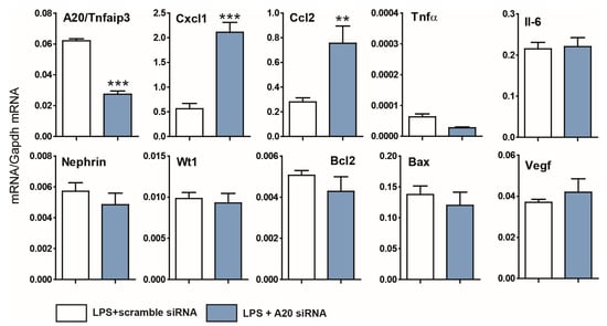 Consequently, our primary objective was to explore the potential role of A20 in podocyte injuries. First, we used an siRNA experimental approach to deplete Tnfaip3 transcripts in the K5P5 podocyte cell line. Transfection with siRNA targeting Tnfaip3 resulted in a marked reduction of over 50% in A20-encoding transcript (Figure 2). To assess the effects of A20 knockdown on the inflammatory response and cell viability in the context of inflammation, the cells were exposed to LPS for 3 h. To mitigate potential discrepancies in cell count and viability, expression levels were normalized against the cell number, total RNA content, and housekeeping genes. Depletion of the Tnfaip3 gene led to a substantial increase in Cxcl1 and Ccl2 chemokine secretion, with no significant alterations observed in Tnf-α (a gene with inherently low expression in podocytes) or the podocyte-specific markers nephrin and Wt1 (Figure 2).