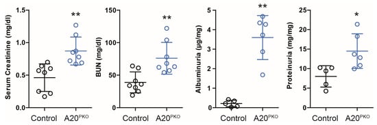 We initially assessed whether specific A20 deficiency in podocytes is associated with spontaneous glomerular changes in 24-week-old A20Δpodocyte mice compared with control mice. A20Δpodocyte mice were generated as described in the Section 2. As anticipated, we noted statistically significant differences in the serum creatinine and BUN levels between the A20Δpodocyte and control mice (Figure 3). Furthermore, A20Δpodocyte mice exhibited accelerated albuminuria and proteinuria compared to control mice.