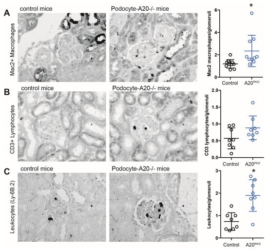 Phenotyping of A20Δpodocyte mice at the age of 6 months reveals differences in the infiltration of immune cells in glomerulus. Sections of kidneys from control and A20Δpodocyte mice were stained for glomerular macrophage (A), CD3+ lymphocyte, (B) and leukocyte (C) infiltration at the age of 6 months. The number of infiltrating cells was assessed in at least 15 glomeruli per kidney (n = 8–10 animals per group). The data are shown as the means ± SDs. * p < 0.05.