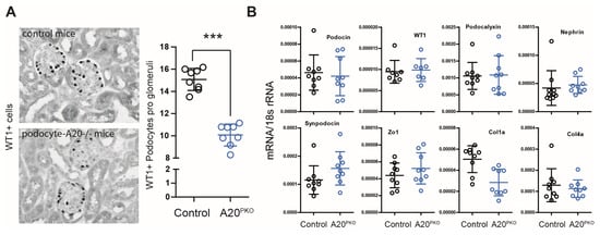 Animal experiments: A20-flox/flox-Nphs2-cre+ (A20PKO, A20Δpodocyte) mice were generated by breeding A20-flox/flox mice, in which loxP sites flanked exons 4 and 5 of the A20 gene, with Nphs2-cre+ mice expressing Cre recombinase under the control of the podocin promoter. This conditional A20 allele allows the tissue/cell-specific inactivation of A20 (out-of-frame transcript) through the expression of Cre recombinase. Both mouse strains were backcrossed on a C57/B6 background, and both strains have been previously described [25,26]. The experimental group consisted of A20-flox/flox-Nphs2-cre+ mice, while the control (Co.) group included mice with either single flox or cre mutations. No differences were observed between the flox+ and cre+ control groups. Additionally, the single mutation had no detectable effect on the phenotype of the mice or on the podocyte phenotype. Spontaneous glomerular damage was characterized in 24-week-old female mice (n = 8–10 per group). We used female mice to avoid enhanced hierarchical behavior during long-term cage housing. Such behavior could lead to injuries that might interfere with the experiments or necessitate premature termination, compromising the study’s integrity. We did not observe any differences between male and female mice in our preliminary studies. The animal experiments were performed in accordance with the European law regarding the protection of animal welfare and with the approval of the local government authorities, Regierung von Oberbayern (reference number: 55.2-1-54-2532-63-12 from 27 February 2015).