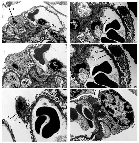In 6-month-old A20Δpodocyte mice, we observed hypocellularity of the glomerular tuft, expansion of the extracellular matrix (b), podocytopenia associated with foot process effacement (e), nuclear chromatin condensation (d), micronuclei (a), and podocyte detachment at the ultrastructural level. In addition to podocyte death, we detected damage to intracapillary endothelial cells with vacuolation of the cytoplasm (c) and condensation of nuclear chromatin. Lower panel left: dying podocyte with micronuclei (f); lower panel right: irregular thickening of the GBM, looking like subepithelial deposit “humps” of immune complexes.