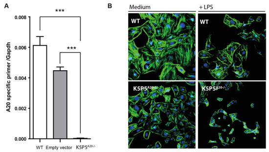 Next, we utilized CRISPR/Cas9 technology to obtain in vitro results. We anticipated that the complete absence of A20 expression achieved through CRISPR/Cas9 would result in more pronounced changes in cellular susceptibility to inflammation compared to those observed with siRNA technology (Figure 2). To elucidate the specific roles of Tnfaip3 in podocytes, we coexpressed Cas9 with gRNA targeting exon 1 of the mouse Tnfaip3 gene in the K5P5 podocyte cell line. Immunoblotting analysis verified the absence of the A20 protein in the knockout (KO) cell lines, K5P5A20−/−, but not in the wild-type (WT) or empty vector cell lines (Figure 8A). While the K5P5A20−/− cell line exhibited normal growth, there was a slight alteration in phenotype during culture. Cellular stress-dependent actin cytoskeleton rearrangements are a well-known outcome of extensive inflammation [36,37].