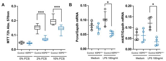 Given the well-established significance of cell shape in determining cell fate, especially concerning cytoskeleton dynamics, which are crucial for podocyte structure and function [39,40], we conducted further experiments. The MTT assay, which characterizes cell metabolism, demonstrated significantly reduced tetrazolium salt (MTT), indicating lower cell metabolic activity in K5P5A20−/− podocytes (Figure 9A). This reduction in metabolic activity may reflect decreased cell proliferation or increased cell death. We did not observe significant differences in the cell proliferation marker Pcna (Figure 9B).