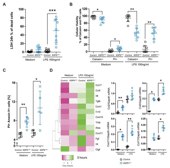 However, we detected significantly increased LDH levels in K5P5A20−/− media following LPS stimulation (Figure 10A). Moreover, we employed fluorescent calcein and PI labeling to assess cell viability. Through fluorescence microscopy, we quantified viable calcein+ cells and cells with compromised cell membrane integrity (PI+ cells). A substantial increase in the percentage of dead cells was observed after 24 h of LPS incubation (Figure 10B), suggesting that the reduced metabolic activity in K5P5A20−/− podocytes was primarily due to increased cell death. These results were confirmed by flow cytometry (Figure 10C). Moving on to chemokines, their dual functions as mediators of cell–microenvironment interactions, including chemotaxis and anoikis, present a plausible link to explain both the in vivo results (glomerular inflammation) and the knockout cell phenotype. Three hours after LPS stimulation, the expression of chemoattractants such as Cxcl1, Cxcl10, Cxcl11, Ccl2, Ccl5, and Ccl17 was elevated in K5P5A20−/− podocytes (Figure 10D). Chemokine genes were upregulated 2- to 50-fold in K5P5A20−/− podocytes both upon LPS stimulation and in unstimulated conditions. Thus, we confirmed that A20 dysfunction in podocytes potentially contributes to increased podocyte death and promotes leukocyte recruitment into the glomerulus. Moreover, A20 in podocytes functions as a protective factor against glomerular inflammation by restraining chemokine production.