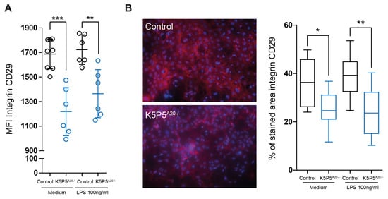 3.5. A20-Knockout K5P5A20−/− Podocytes Are More Susceptible to Cytoskeleton Rearrangements and Show a Reduction in Integrin b1 Expression