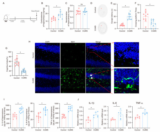 CUMS induces cognitive decline and activates neuroinflammation in mice. (A) Schematic illustration of the experimental timeline for CUMS and behavioral testing. (B) Hippocampal corticosterone concentrations (ng/mg) in Control and CUMS mice at the conclusion of the CUMS protocol (n = 10; Student’s t-test, * p < 0.05). (C) Concentrations (ng/mg) of norepinephrine in the hippocampus tissues of Control and CUMS mice at the end of the CUMS procedure (n = 10, Student’s t-test, ns: no significant). (D) Representative track images of mice in the probe trial of MWM. (E,F) Escaping latency and Crossing-platform Times of mice (n = 10, Student’s t-test, * p < 0.05). (G) Cognitive Index of mice (n = 10, Student’s t-test, * p < 0.05). (H) Representative images of IF staining of hippocampal sections from Control and CUMS mice. Iba-1, green; DAPI, blue. Scale bar, 50 μm. (I) Levels of IL-1β, IL-6, and TNF-α in hippocampus lysates from Control and CUMS mice as determined by ELISA (n = 10, Student’s t-test, * p < 0.05). (J) The mRNA level for the IL-1β, IL-6, and TNF-α in hippocampus lysates from Control and CUMS mice (n = 6, Student’s t-test, * p < 0.05).