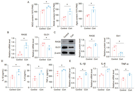 Corticosterone induces neuroinflammation in primary microglia and the high level of MGO and its derivatives. (A) Concentrations of MGO, RAGE, and Ages in primary microglia cells from Control and Cort as determined by ELISA (n = 3, Student’s t-test, * p < 0.05). (B) qRT-PCR assays monitoring expression levels of RAGE and GLO1 in primary microglia cells (n = 3, Student’s t-test, * p < 0.05). (C) The protein level of RAGE and GLO1 in primary microglia cells (n = 3, Student’s t-test, * p < 0.05). (D) Concentrations of IL-1β, IL-6, and TNF-α in primary microglial cells as quantified by ELISA. (n = 3, Student’s t-test, * p < 0.05). (E) The mRNA level of IL-1β, IL-6, and TNF-α in primary microglia cells (n = 3, Student’s t-test, * p < 0.05).